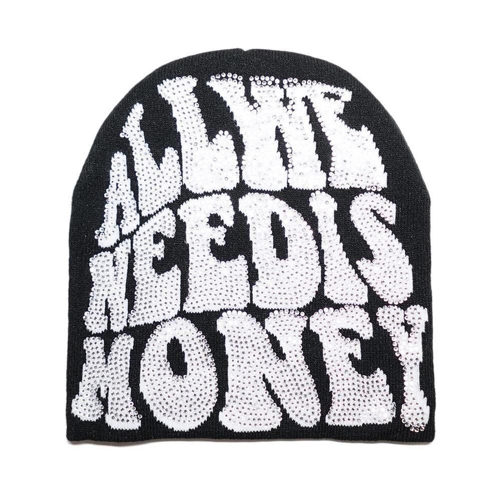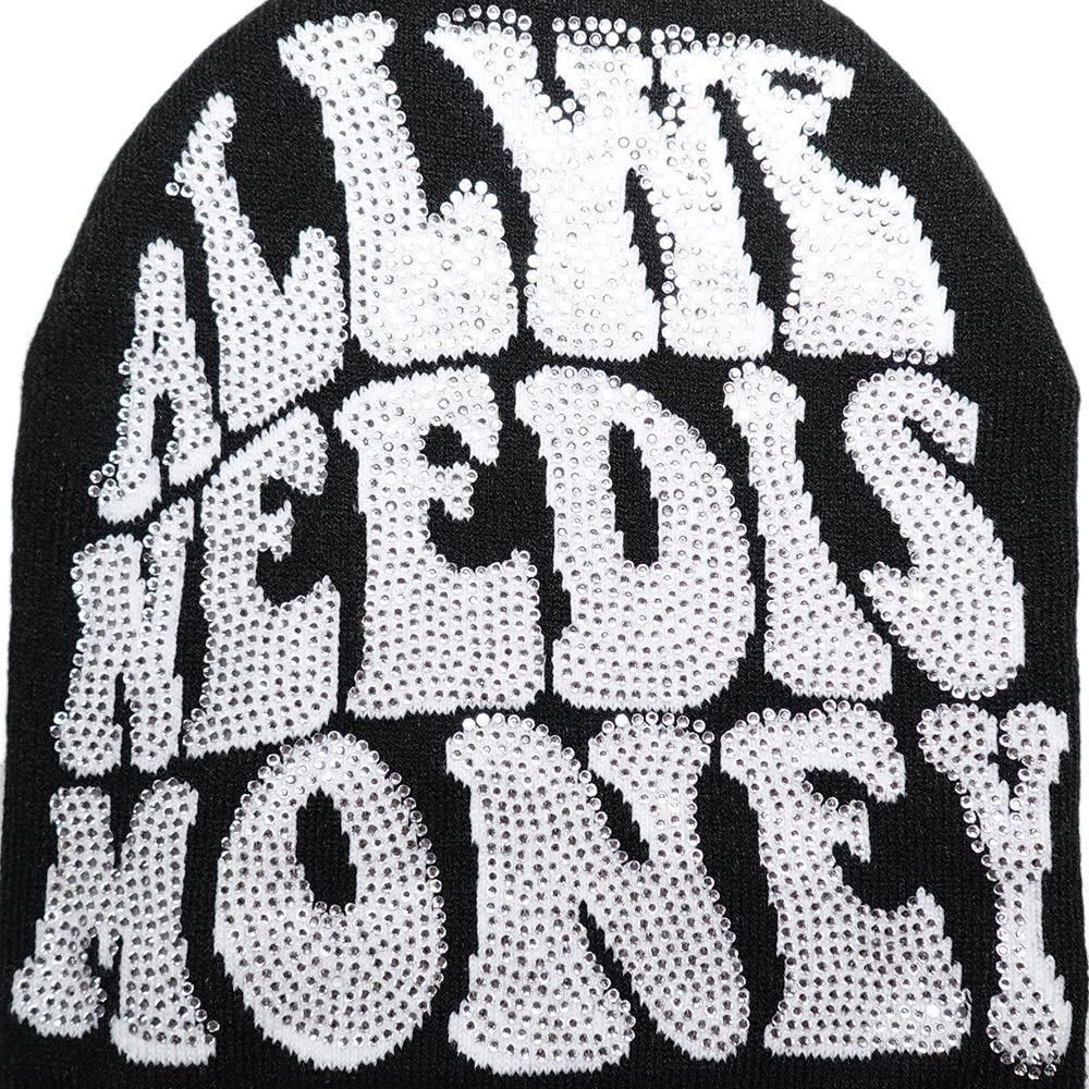 Rhinestone Skullcap Beanie “All We Need Is Money” / Black x White