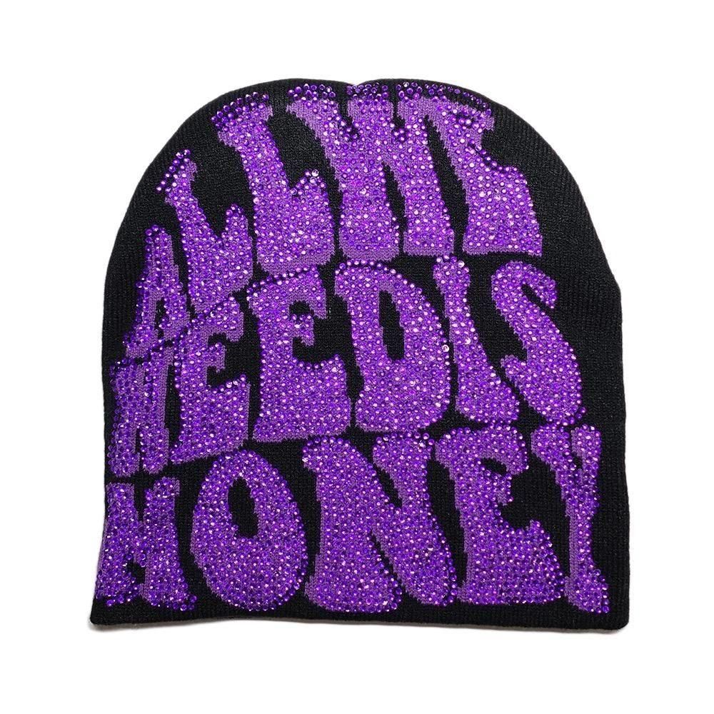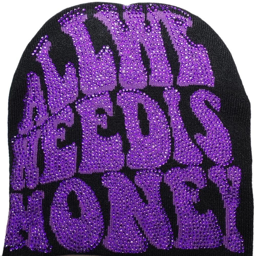 Rhinestone Skullcap Beanie “All We Need Is Money” / Black x Purple