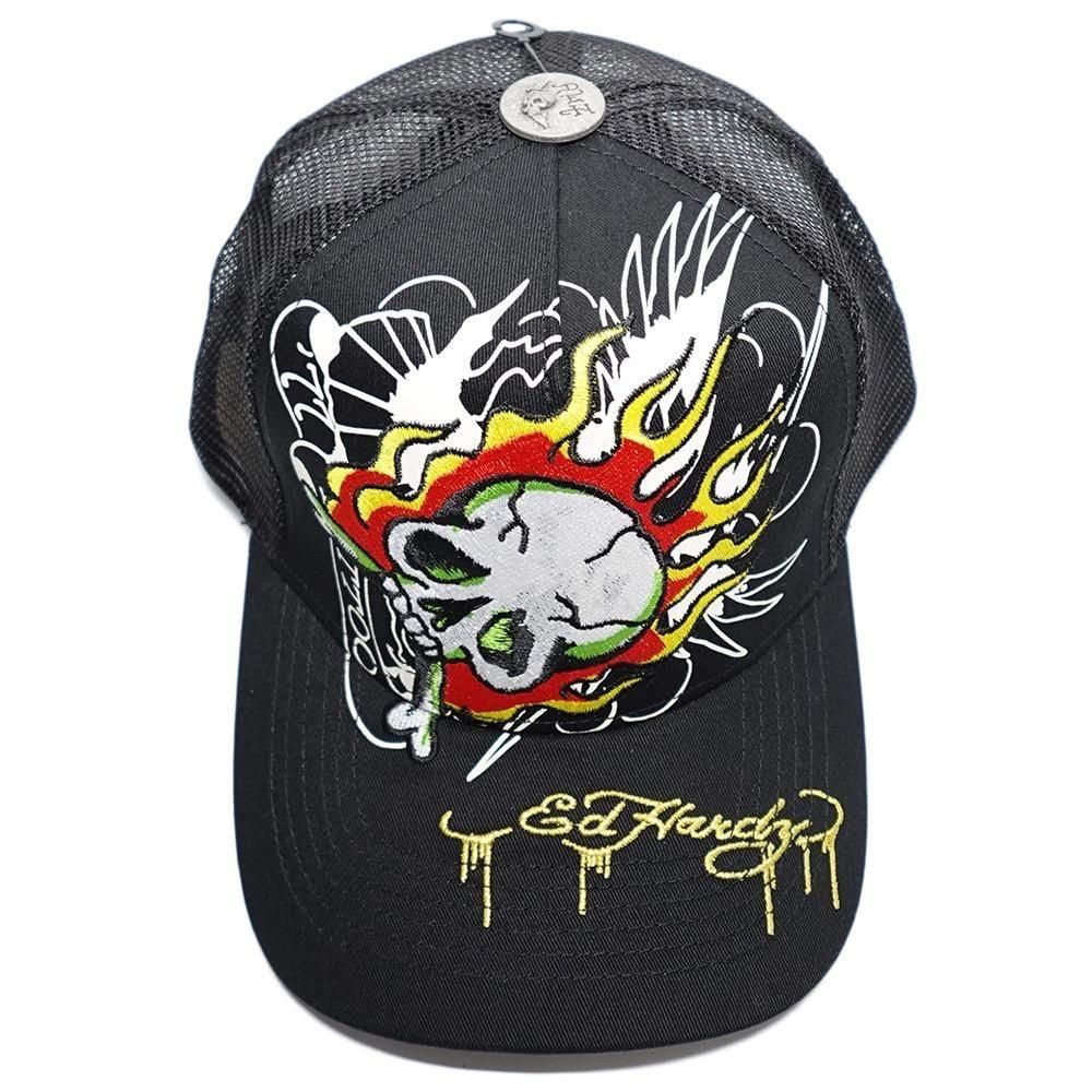 Ed Hardy Embroidered Fire Skull Trucker Mesh Cap / Black